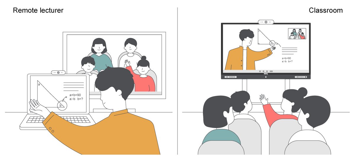 找到講者並排定好課程時間後,您只需要在您的 BenQ 教育顯示器上加入通話。如果顯示器已連結電腦,您就可以直接在顯示器上執行 Google Meet。您也可以使用筆記型電腦加入通話,再將螢幕延伸或複製到 BenQ 顯示器。使用廣角的 BenQ 視訊會議攝影機,就能確保講師能聽到並看到教室內所有人的聲音,並且可以點名舉手發問的學生。