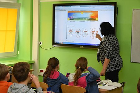 為了提高學生學習興趣、促進同儕間的合作,BenQ 協助安裝 4 台大型觸控互動顯示器。並且提供老師 EZWrite 電子白板書寫軟體與 NFC 觸控筆,讓老師設計教案,引導學生使用觸控顯示器互動學習。